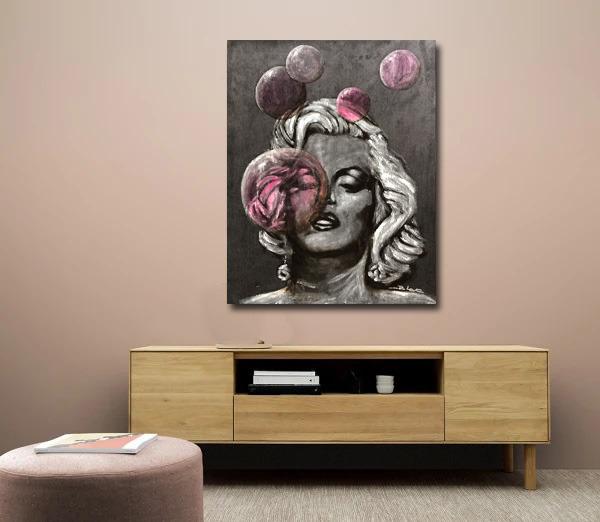 Oeuvre originale entièrement peinte à la main de Marylin Monroe sous les bulles roses Oeuvre n°23066 Format 68x87cm, peinture acrylique sur un fond en velours gris anthracite grosses côtes. Prêt à...