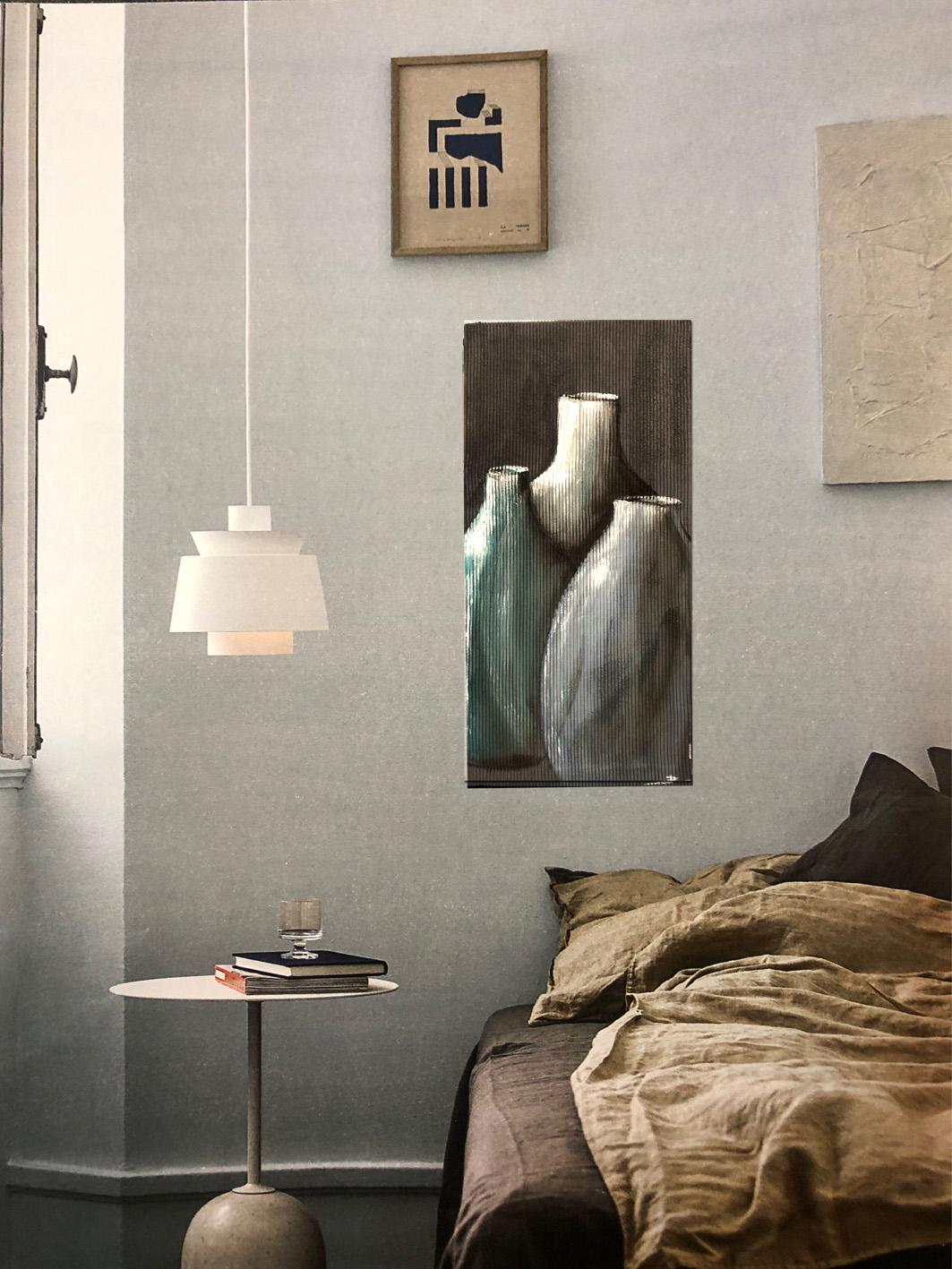 Tableau de jarres bleu foncé, bleu avio et bleu ciel sur un fond lin blanchi Oeuvre originale n°23112 Format 20x40cm Vendu avec un certificat d'authenticité Prêt à accrocher