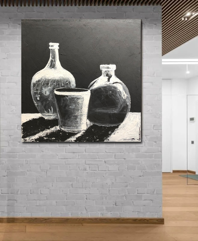 Oeuvre originale de jarres blanches sur un fond béton noir Oeuvre n°23065 Peinture acrylique, entièrement peint à la main Prêt à accrocher Vendue avec un certificat d'authenticité