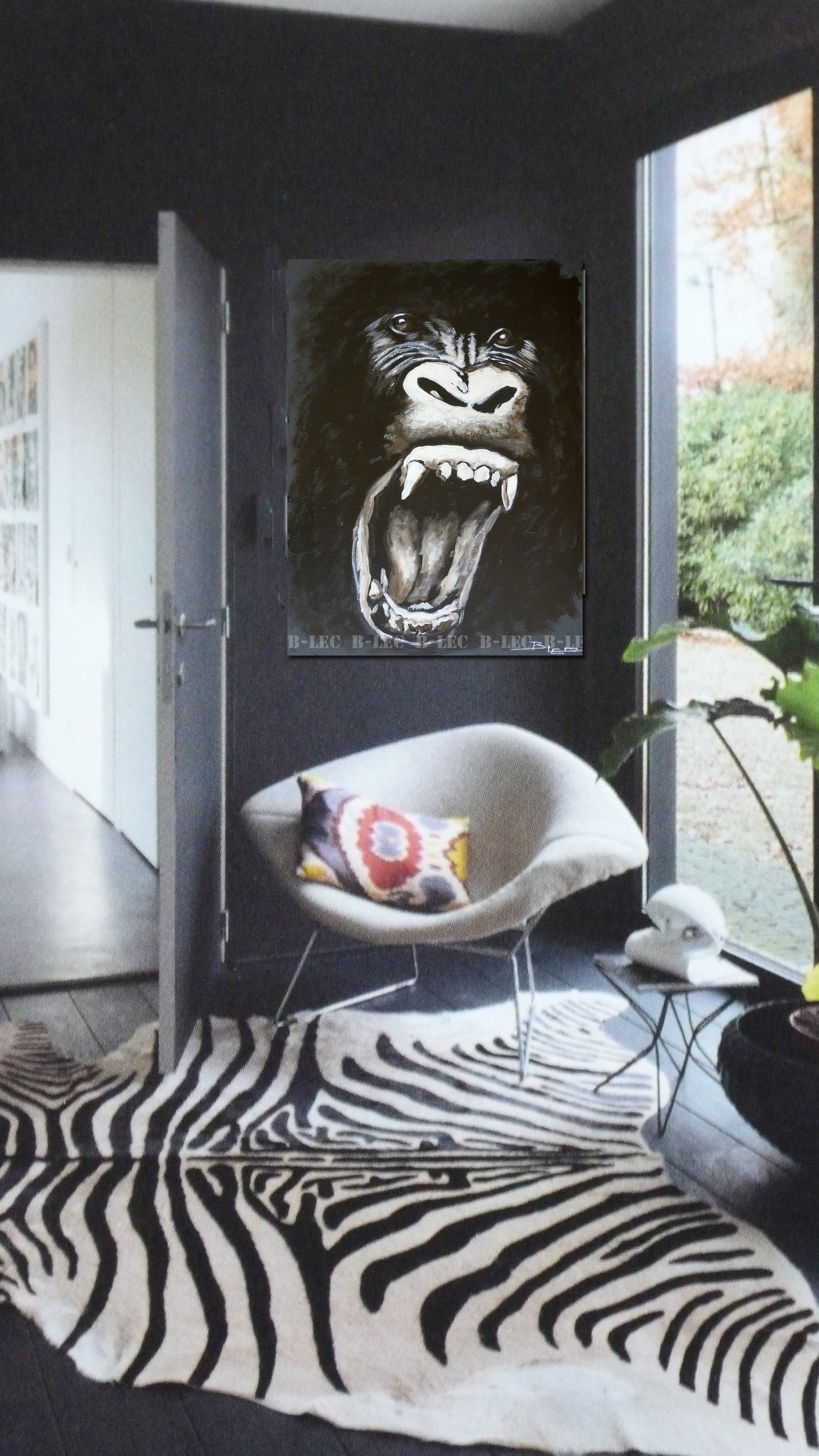 N°19001 Gorille tons noir et blanc .Format 60x45cm. Modèle original entièrement peint à la main sur un fond béton gris anthracite, finition mate, peinture acrylique au couteau. Existe en...