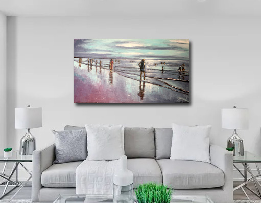 Oeuvre originale n°20030/25 entièrement peinte à la main de personnages se promenant sur la plage de St Gilles Croix de Vie...ou d'ailleurs Peinture acrylique Format 35x90cm , monté sur châssis...