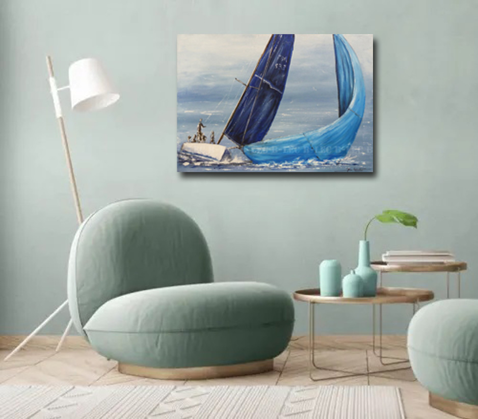 Oeuvre originale n°23015 de voiliers blancs sur une mer calme. Peinture acrylique, entièrement peint à la main. Format 25x25cm Prête à accrocher Tableau vendu avec un certificat d'authenticité