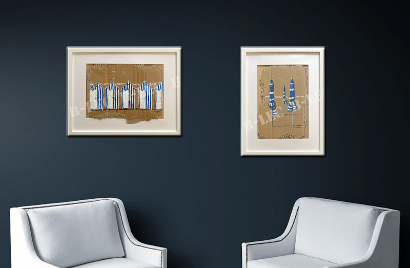 Cabine et Parasols - Œuvre Originale Peinte à la Main Découvrez un chef-d'œuvre unique et authentique Laissez-vous séduire par cette magnifique œuvre d'art intitulée "Cabine et parasols", une pièce...